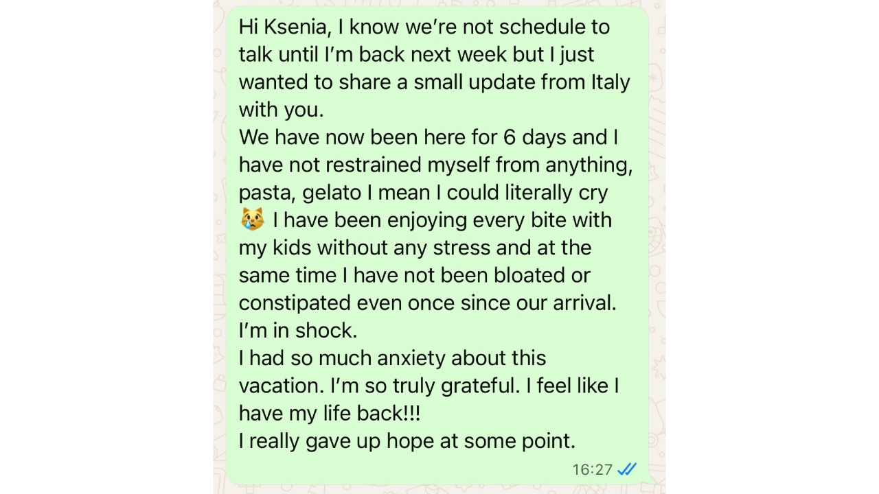 Within 12 weeks, she went to Italy. Ate the pasta. Drank the wine. No bloating, no baggy bloat-safe outfits. No panic.